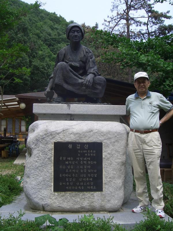 '콩밭 매는 아낙네야/ 베적삼이 흠뻑 젖는다'로 유명한 칠갑산 노래의 '노래비' 옆에서 한 컷. 원로 박칠성 조각가의 작품으로 '산마루 집'에 있다. ~