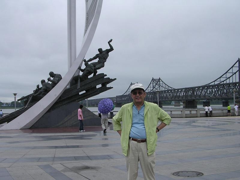 중국 단둥의 강변공원에서 압록강 철교를 배경으로 ~
