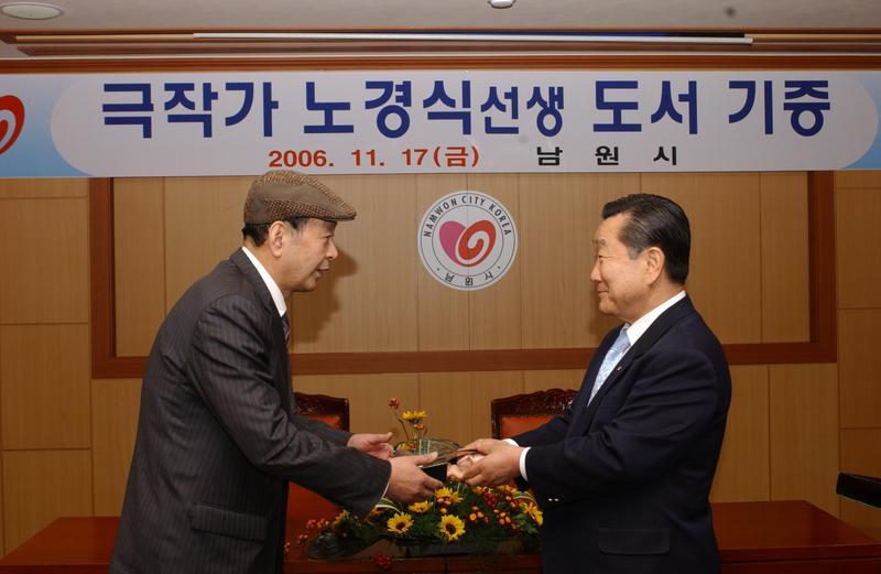 한평생 모은 장서 3천여 권을 남원 고향에 기증한 기념으로, 남원시장(최중근)에게서 '감사패'를 받는 모습.