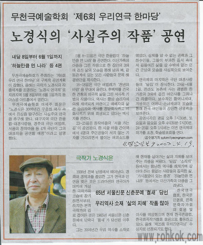 '영남일보'의 보도기사. 노경식의 사실주의 작품 공연 등등---